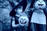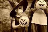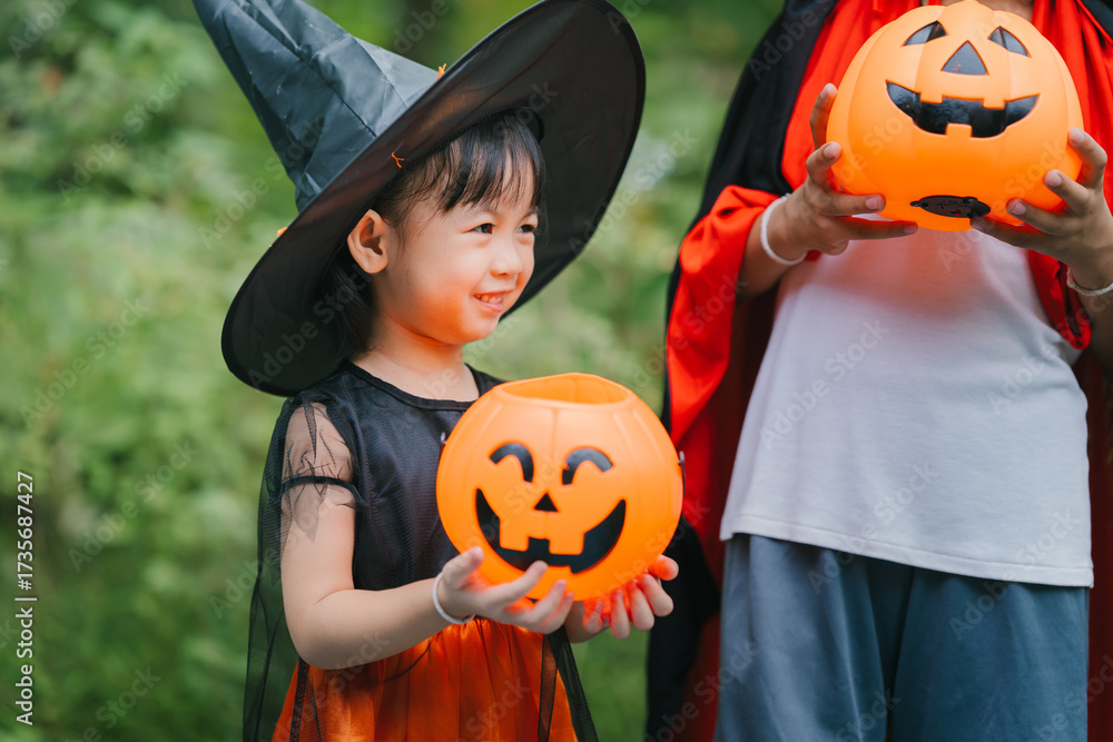 Two young children in Halloween costumes stand outdoors, holding pumpkin buckets with jack-o’-lantern faces. Wearing witch hats festive outfits, they share playful smiles, surrounded by lush green