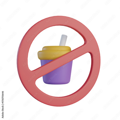Stylized No Drinks Concept in 3D Rendering with Red Prohibition Sign Purple Cup and Straw on Transparent Background