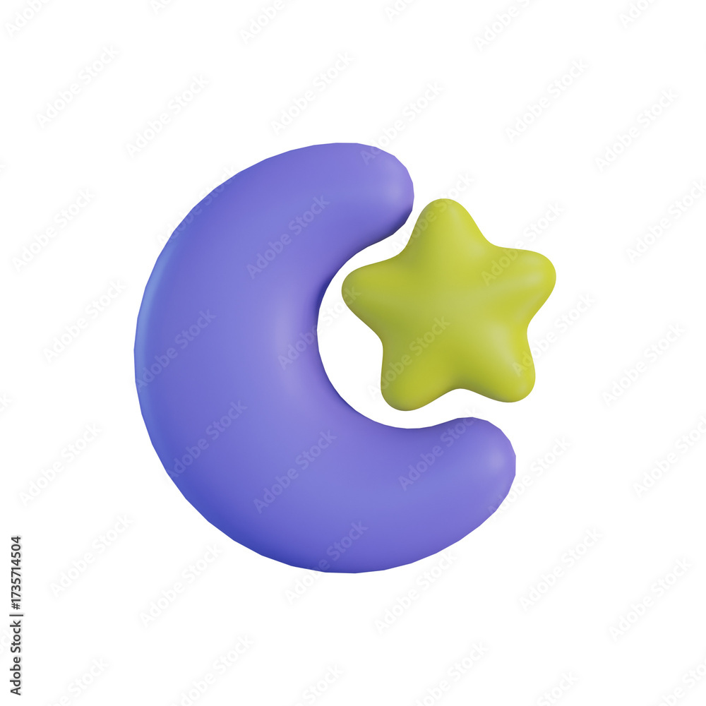 Stylized Purple Crescent Moon and Yellow Star Floating in Transparent Background