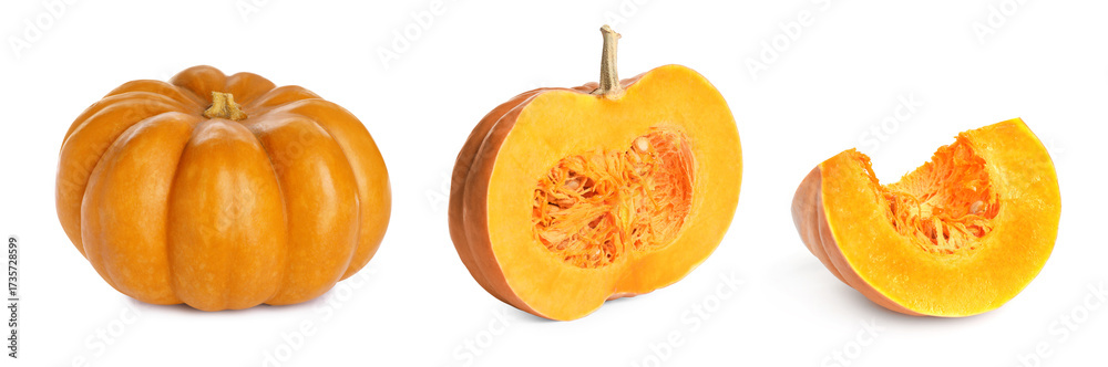 Fresh pumpkin isolated on white, set. Whole, half and piece