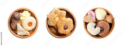 Variety of Christmas cookies and biscuits in wooden bowls. Traditional gingerbread and butter cookies, in different shapes, filled with jam, dipped in chocolate, and topped with nuts or sprinkles.