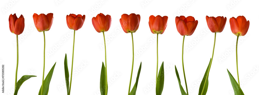 Bright red tulips standing tall in a row against a clean white backdrop create a joyful scene of springtime beauty and freshness