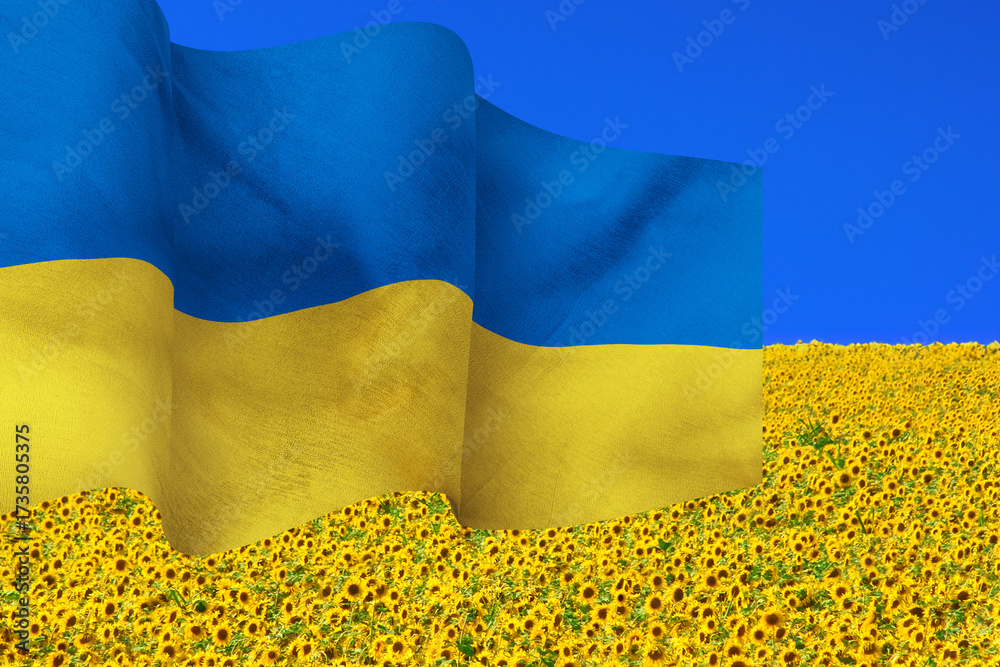 Vibrant Ukrainian flag waves over a field of bright sunflowers under a clear blue sky