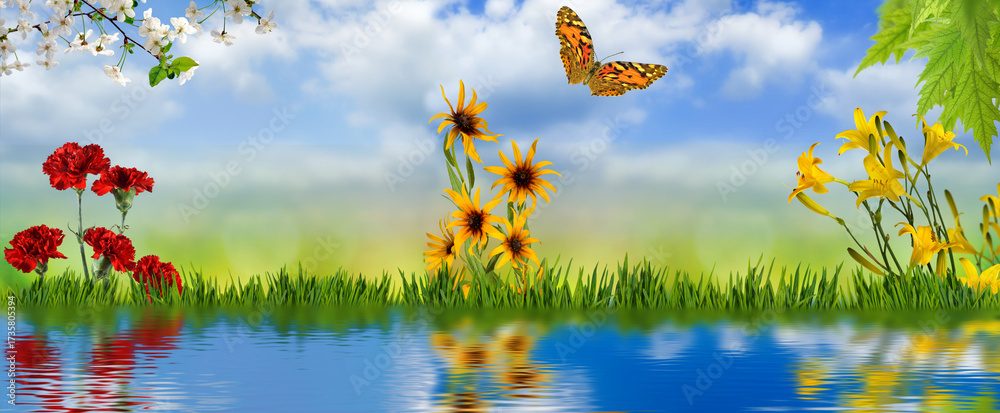 Colorful butterfly dancing over vibrant flowers near a serene pond under a clear blue sky