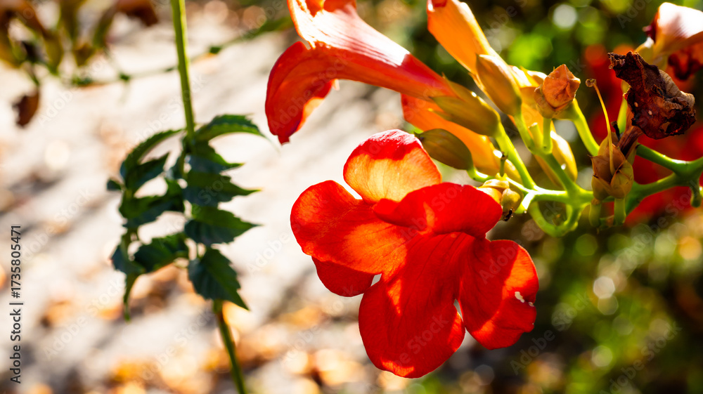 Vibrant red flowers bloom against a lush green backdrop in midday sunlight at a garden