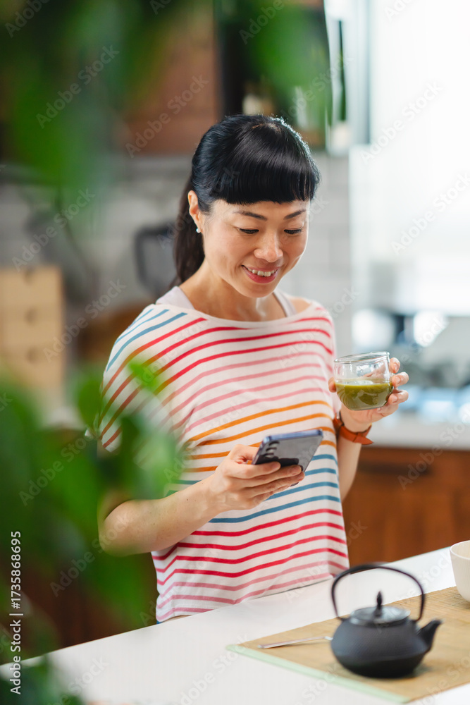 Smiling Japanese woman holding glass of green tea while using smartphone in kitchen. Cheerful Asian woman enjoying healthy drink, relaxation and modern digital lifestyle