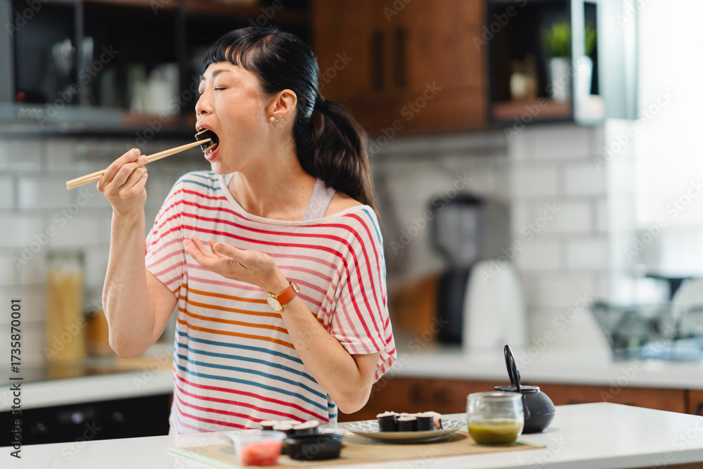 Smiling woman enjoying homemade sushi at kitchen table with tea and condiments. Relaxed Asian woman dining at home, representing healthy lifestyle and traditional Japanese food