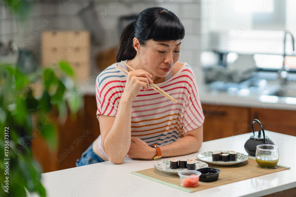 Smiling woman enjoying homemade sushi at kitchen table with tea and condiments. Relaxed Asian woman dining at home, representing healthy lifestyle and traditional Japanese food
