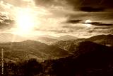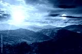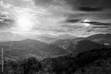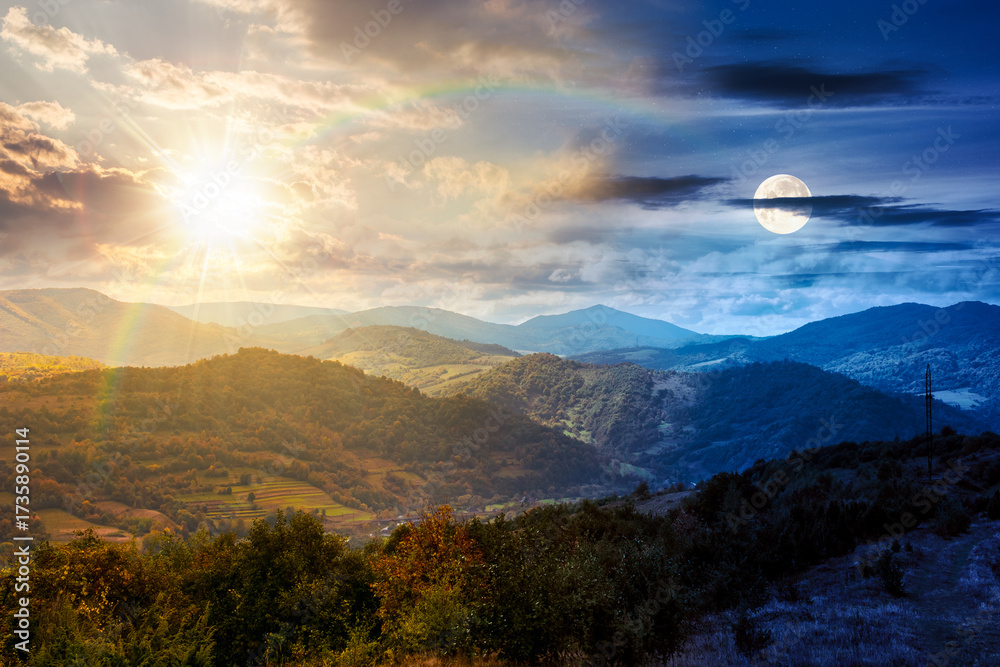 autumn equinox landscape in mountains. beautiful view of countryside. day and night time change concept. alps in the background. cloudy sky. picturesque rural scenery with village with sun and moon