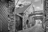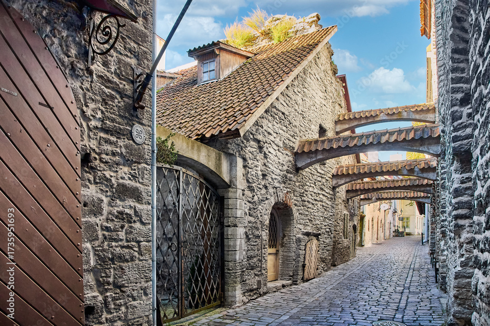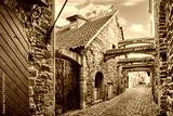 Medieval stone street with archways and rustic buildings in historic European town. Narrow cobblestone street with medieval stone walls, wooden doors and tiled archways in an old European town.