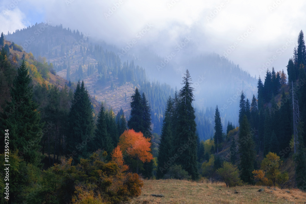 autumn mountain landscape in the Trans-Ili Alatau region near Almaty, Kazakhstan. The mountains are covered in dense coniferous forest, shrouded in fog, but deciduous trees with vibrant autumn colors