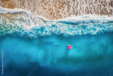 Aerial view of slim woman swimming on the pink swim ring in the transparent turquoise sea in Oludeniz,Turkey. Summer seascape with girl, beautiful waves, colorful water at sunset. Top view from drone
