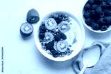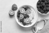 Top View of Raspberry Yogurt in White Bowl with Fresh Kiwi Topping and Ripe Raspberries on Bright Background, Healthy Dessert and Breakfast Concept