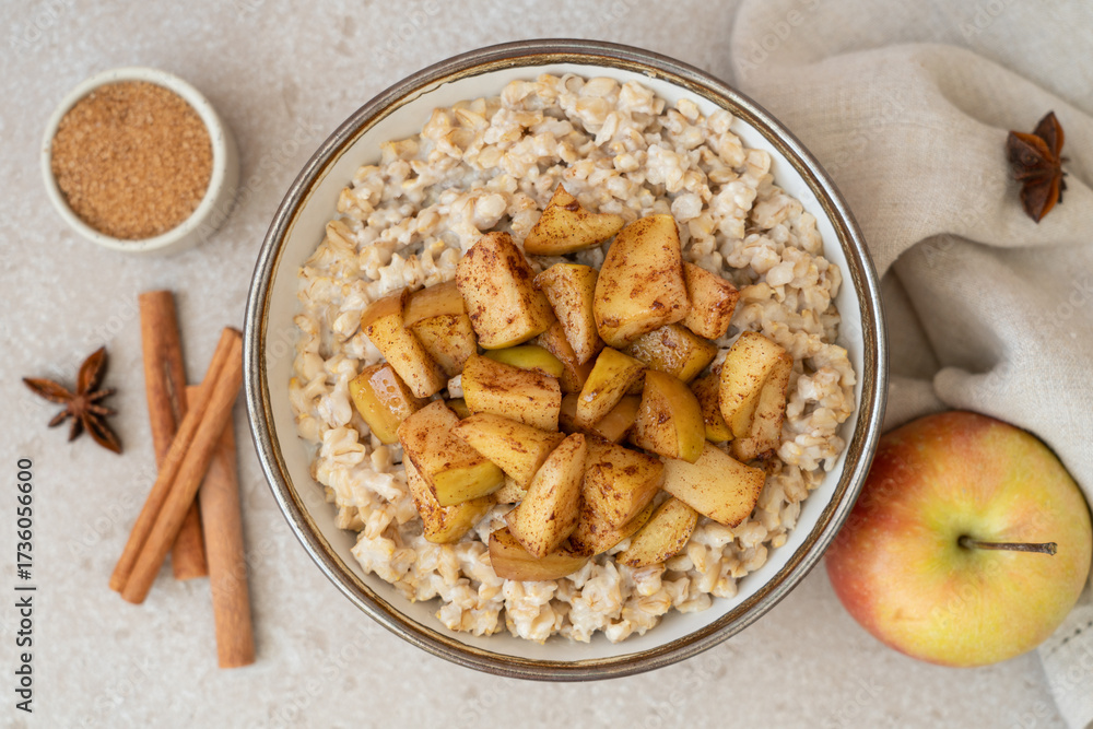 Oatmeal Porridge with Caramelized Apples and Cinnamon. Autumn Breakfast