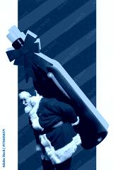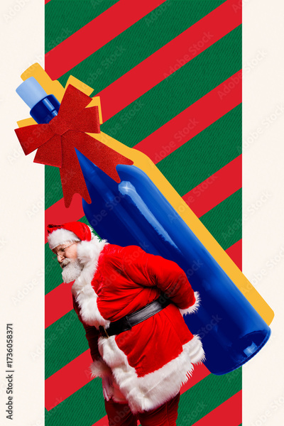 Exclusive image art pop trend collage of happy old man santa claus hold champagne bottle bow present new year celebration event