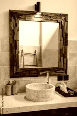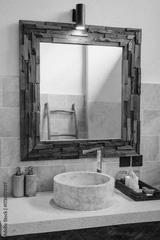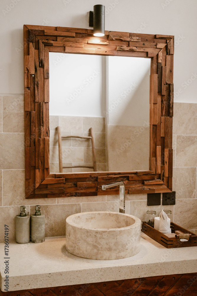 Vertical image of a sand coloured bathroom interior design with a sink made of granite and a mirror made with loose pieces of wood inside a hotel room with natural light during holiday in Bali.