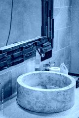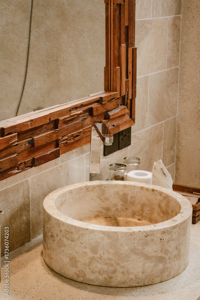 Vertical image of a sand coloured bathroom interior design with a sink made of granite and a mirror made with loose pieces of wood inside a hotel room with natural light during holiday in Bali.