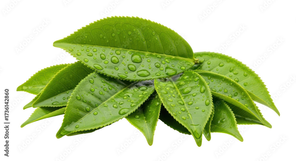 Isolated group of tea leaves with water droplets, lush green healthy ingredient for drinks