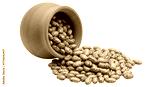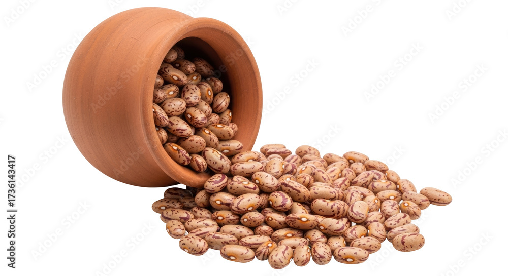 Isolated pinto beans spilled from a clay pot, culinary ingredient for vegan diet