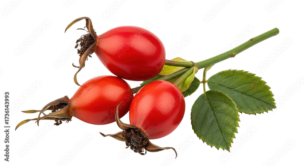 Isolated rose hips on stem, ripe red fruit for food and medicine, vitamin C boost, antioxidant