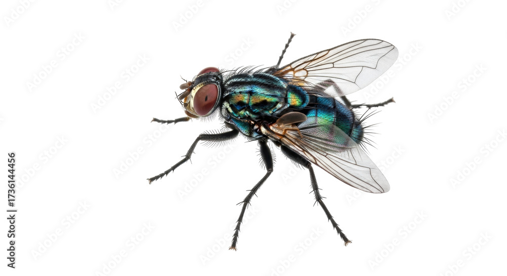 Isolated colorful fly species macro studio shot, detail wings, insect closeup, pest control