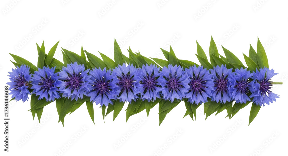 Isolated blue cornflower blossoms with green leaves, vibrant floral arrangement for designs