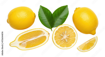 Isolated Citrus fruit assortment of whole, halved, and sliced lemon still life arrangement