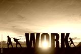 Silhouettes of people drawing the word WORK on a sunset background, business concept