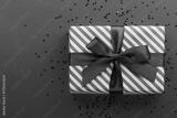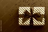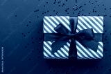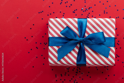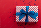 Gift box on color background, flat lay, space for text