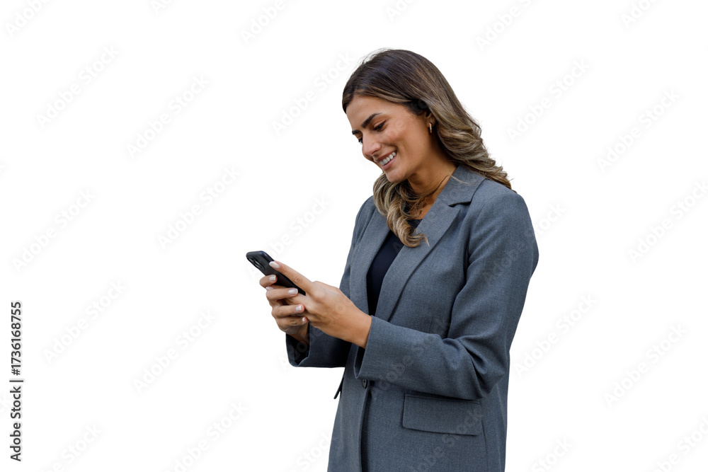 Young businesswoman smiling, reading or texting on mobile phone, showing communication, networking and technology concepts, transparent background
