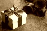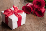 Valentine greeting card background with gift box, fresh burgundy roses and assorted hearts