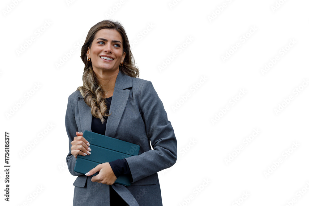 Professional businesswoman smiling, working on laptop, managing business, embodying remote work and technology on transparent background