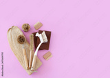 Top view cleaning supplies, bamboo brushes and natural sponges, zero waste household concept on a pink background