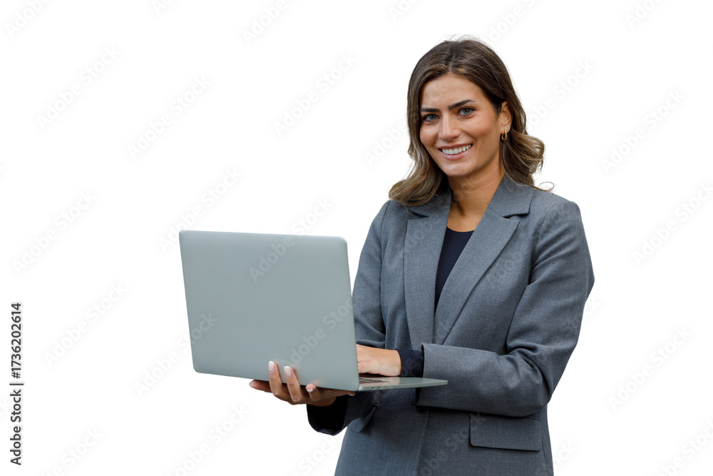 Businesswoman smiling, holding laptop, representing modern professional remote work and technology on transparent background