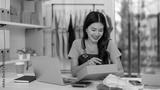 Asian female entrepreneur efficiently packing clothing orders for her thriving online store from a modern home office managing her small business success