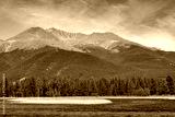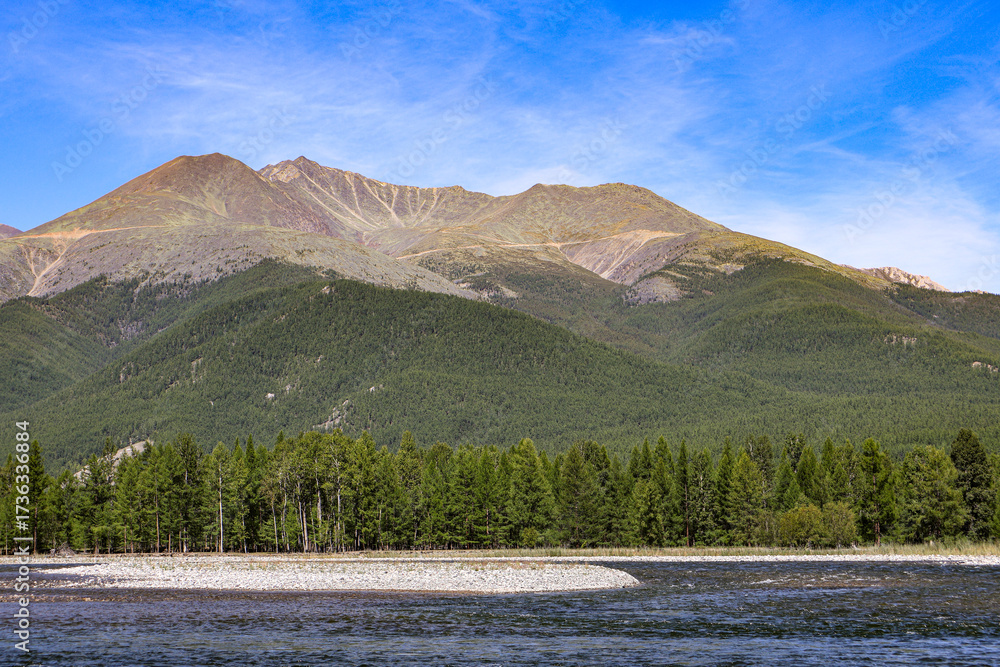 Summer adventure view of rugged mountains, tundra slopes, and powerful mountain river