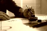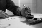 Calligraphy. Woman with brush, ink and handwritten cards at table, closeup