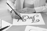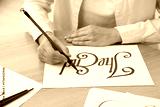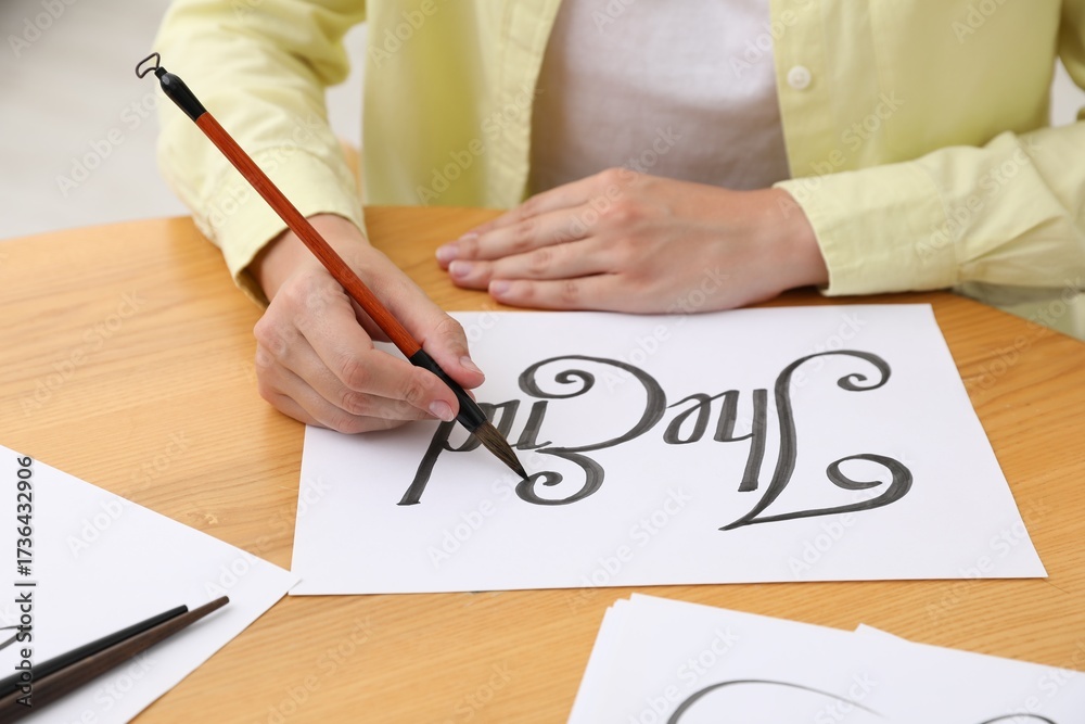 Calligraphy. Woman with brush writing words The End on sheet of paper at wooden table indoors, closeup