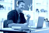 Man in headphones taking notes while passing online test via laptop at table indoors