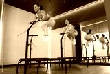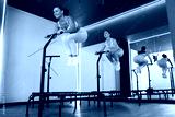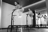 Smiling women jumping on mini exercise trampolines in fitness studio, low angle view