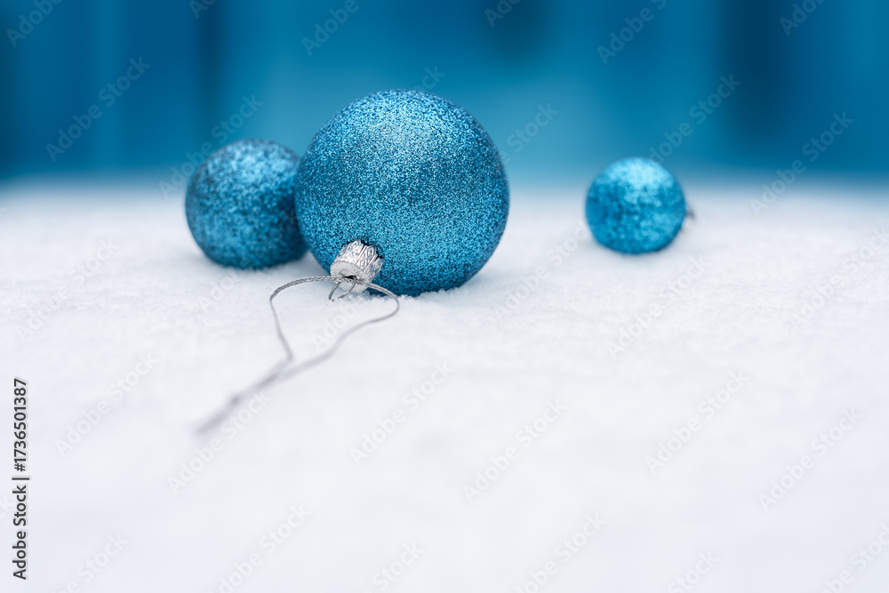 Blue Christmas Baubles On Snow With Festive Blue Background And Copy Space
