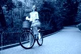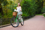 Woman riding bicycle with flowers in basket outdoors. Space for text