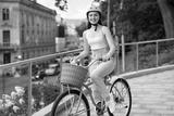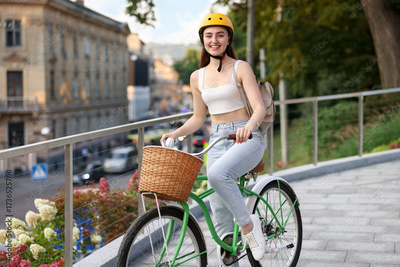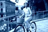 Woman in helmet riding bicycle on city street