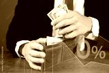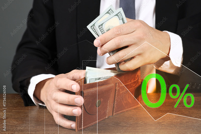 Zero percent commission. Man putting dollars into wallet at table, closeup