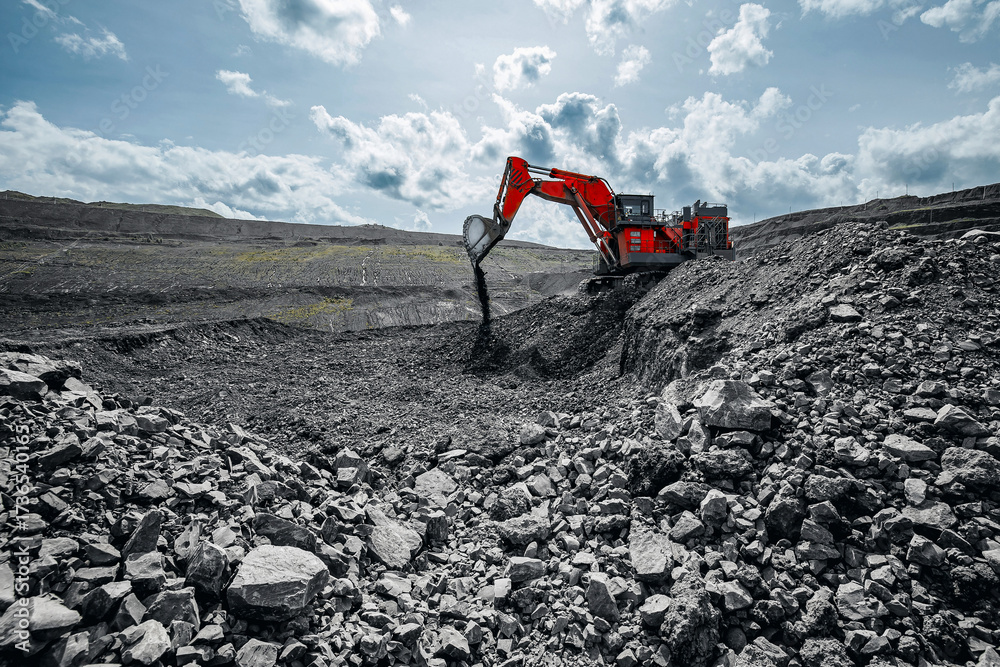 Heavy excavator machinery operating under cloudy sky, Open pit mine process, industry landscape.