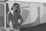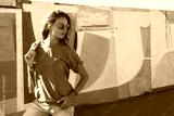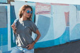 Model wearing plain tshirt and sunglasses posing over street wall