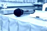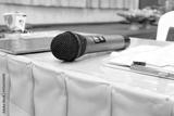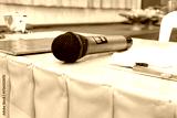 Black microphone on table background.