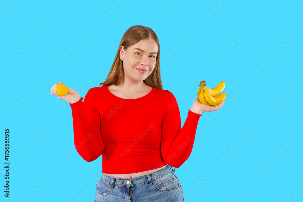 A woman wearing a vibrant red shirt is holding a bright yellow lemon in one hand and a bunch of bananas in her other hand