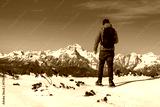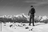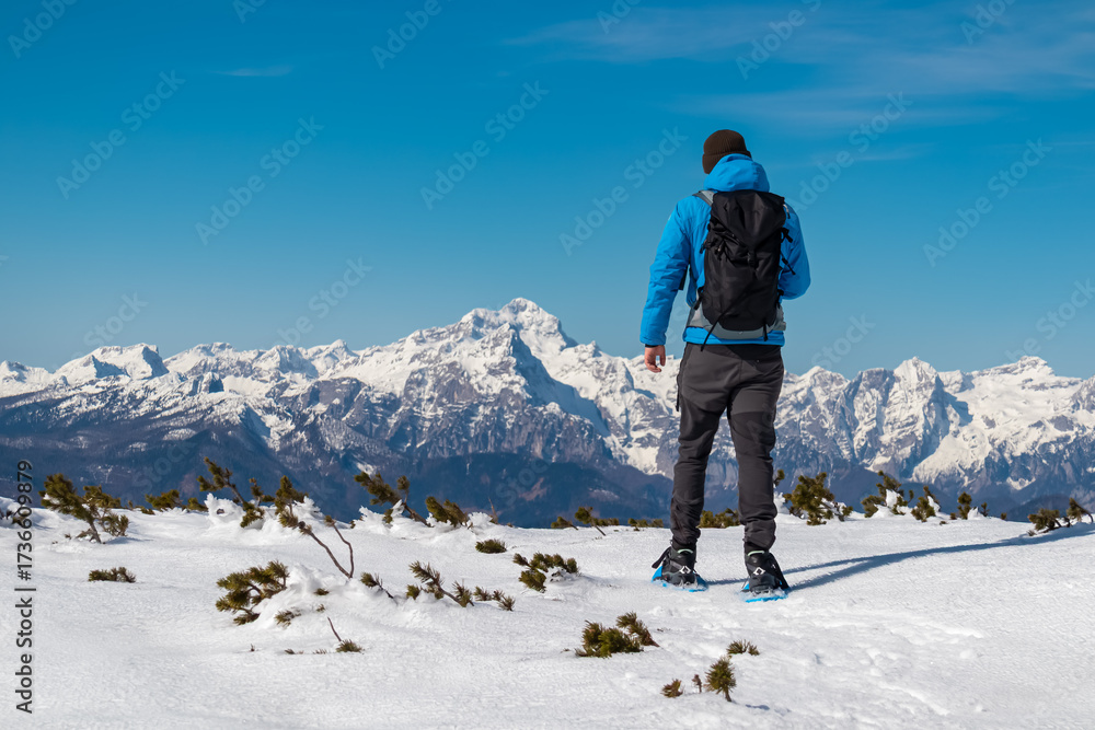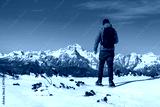 Hiker in blue jacket stands on snowy Bärentaler Kotschna plateau, gazing towards the towering Triglav and dramatic Karawanks range, capturing the spirit of alpine adventure on Austria-Slovenia border