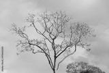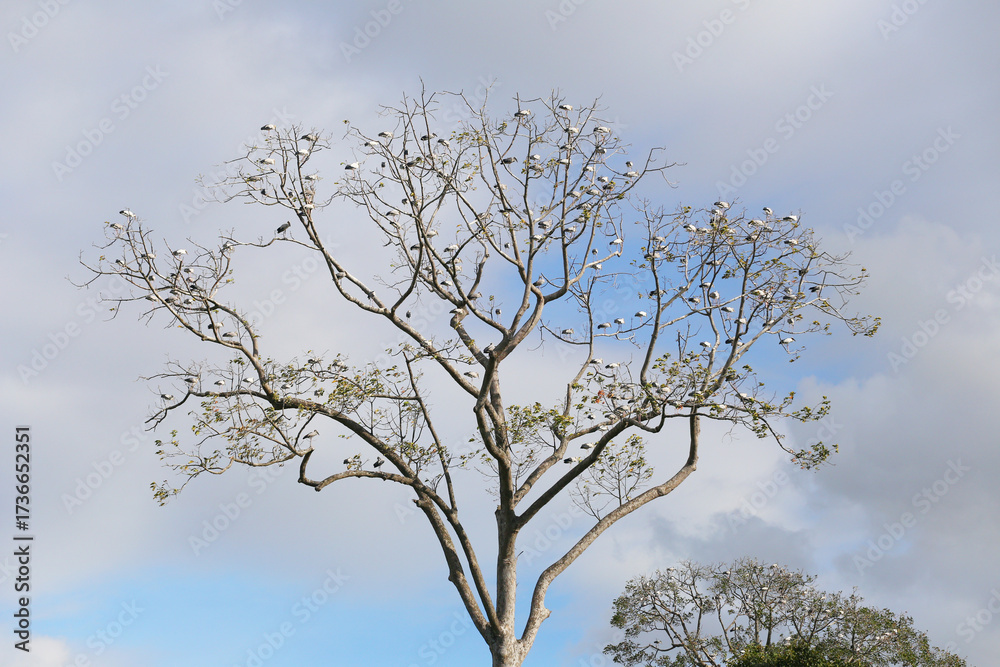 Many Asian Openbill were sitting on the branches of a large tree that didn't have many leaves.